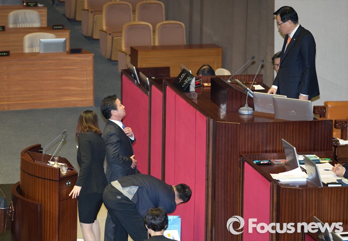 (서울=포커스뉴스) 테러방지법 직권상정에 반발해 야당이 무제한 토론(필리버스터)를 일주일째 진행하며 총 130시간을 돌파한 29일 오전 서울 여의도 국회 본회의장에서 정의화(오른쪽) 국회의장과 토론을 마친 홍종학 더불어민주당 의원이 대화하고 있다.
