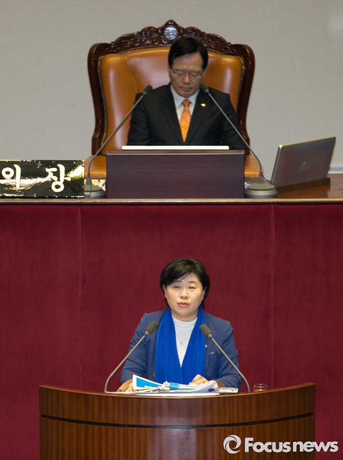 (서울=포커스뉴스) 테러방지법 직권상정에 반발해 야당이 무제한 토론(필리버스터)를 일주일째 진행하며 총 130시간을 돌파한 29일 오전 서울 여의도 국회 본회의장에서 토론에 참여한 서영교 더불어민주당 의원이 발언하고 있다.
