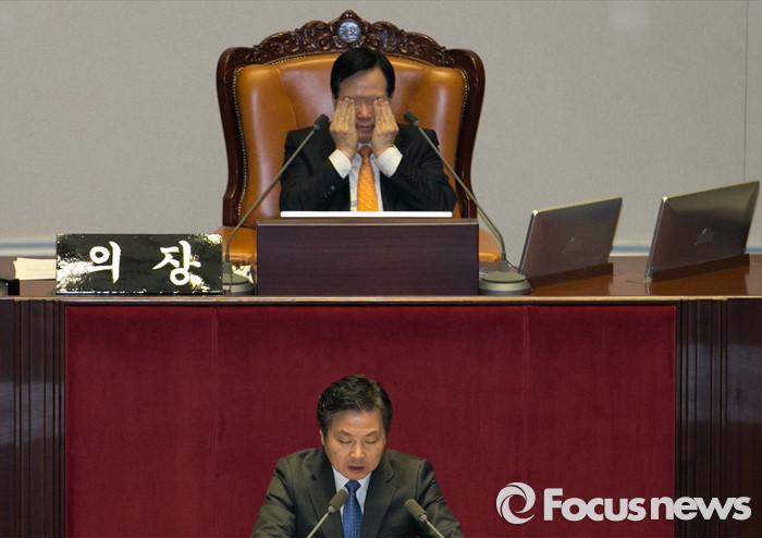 (서울=포커스뉴스) 테러방지법 직권상정에 반발해 야당이 무제한 토론(필리버스터)를 일주일째 진행하며 총 125시간을 돌파한 29일 오전 서울 여의도 국회 본회의장에서 정의화 국회의장이 피곤한 모습을 보이고 있다.