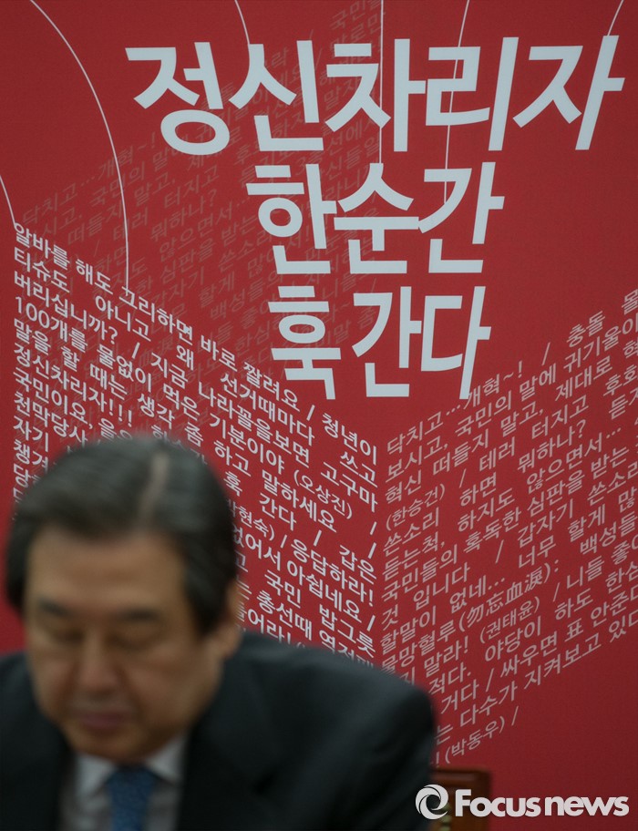 (서울=포커스뉴스) 29일 오전 서울 여의도 국회에서 열린 새누리당 최고위원회의에 참석한 김무성 대표 뒤로 국민의 쓴소리 백보드가 보이고 있다.