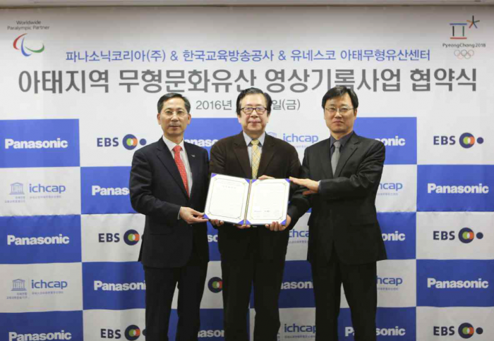 파니소닉은 앞으로 우즈베키스탄을 포함한 중앙아시아 4개국과 몽골에 초고화질(UHD) 급의 영상카메라와 관련 장비들을 제공할 예정이다.유네스코아태무형유산센터와 파나소닉코리아가 지난 26일 약정체결식을 개최했다. 사진 왼쪽부터 노운하 파나소닉코리아 대표이사, 허권 유네스코아태무형유산센터 총장, 김병수 한국교육방송공사 방송제작본부장.<사진제공=문화재청>