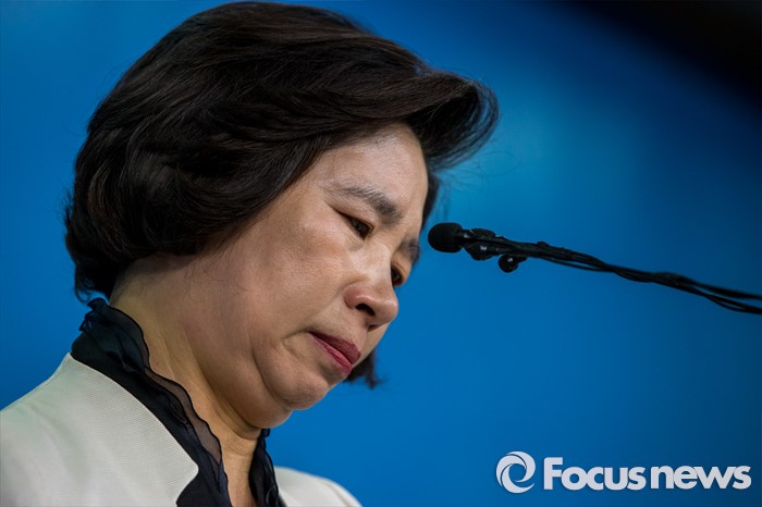 (서울=포커스뉴스) 더불어민주당의 '현역의원 평가 하위 20%'에 걸려 컷오프(공천배제)된 전정희 의원이 29일 오전 서울 여의도 국회 정론관에서 탈당 기자회견을 하던 중 생각에 잠겨 있다.