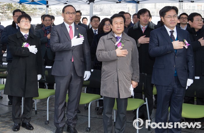 (세종=포커스뉴스) 홍윤식(왼쪽 두 번째) 행정자치부 장관이 29일 오전 세종시 어진동 대통령기록관 전시관 입구에 마련된 무궁화정원 개장식 행사에 참석해 국기에 대한 경례를 하고 있다.