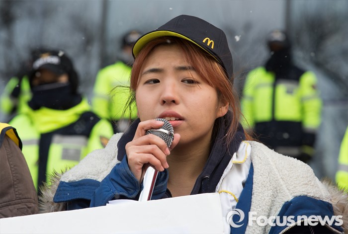 (서울=포커스뉴스) 29일 오전 서울 종로구 한국맥도날드본사 앞에서 알바노조 조합원이 '45초 햄버거, 17분 30초 배달제 폐지' 등 10대 안건을 들고 단체교섭을 요구하는 기자회견을 하고 있다.