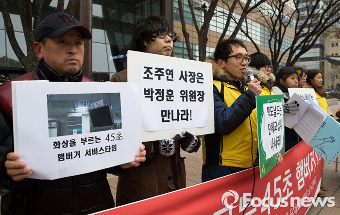 (서울=포커스뉴스) 29일 오전 서울 종로구 한국맥도날드본사 앞에서 알바노조 조합원들이 '45초 햄버거, 17분 30초 배달제 폐지' 등 10대 안건을 들고 단체교섭을 요구하는 기자회견을 하고 있다.