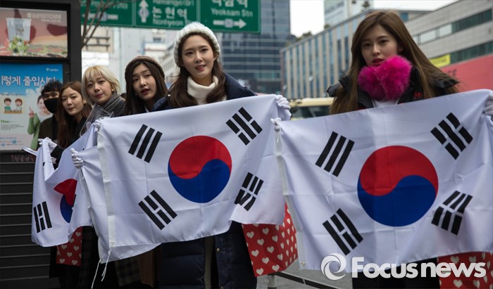 (서울=포커스뉴스) 3·1절을 하루 앞둔 29일 오전 아이돌걸그룹 '다이아'가 서울 강남역 앞에서 태극기 나눔행사를 하고 있다.
