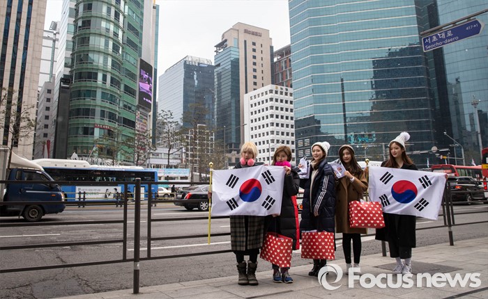 (서울=포커스뉴스) 3·1절을 하루 앞둔 29일 오전 아이돌걸그룹 '다이아'가 서울 강남역 앞에서 태극기 나눔행사를 하고 있다.