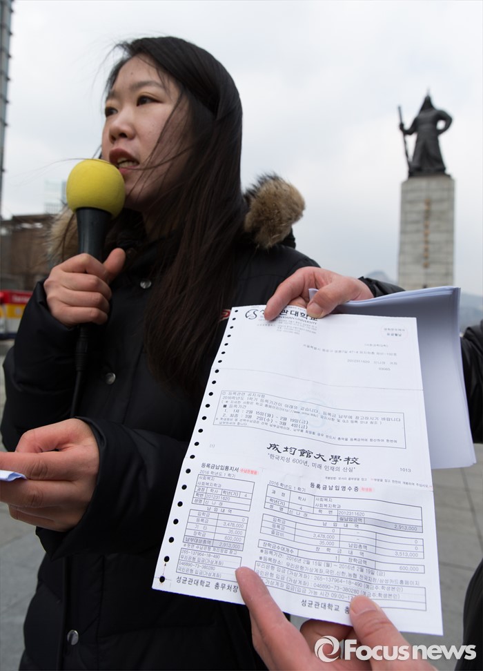 (서울=포커스뉴스) 29일 오후 서울 광화문광장에서 21세기 한국대학생연합 회원들이 정부의 반값등록금을 촉구하는 기자회견을 하고 있다.