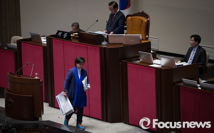 (서울=포커스뉴스) 테러방지법 직권상정에 반발해 야당이 무제한 토론(필리버스터)를 일주일째 진행하며 총 135시간을 돌파한 29일 오후, 서영교 더불어민주당 의원이 서울 여의도 국회 본회의장에서 토론을 마친 후 퇴장하고 있다.