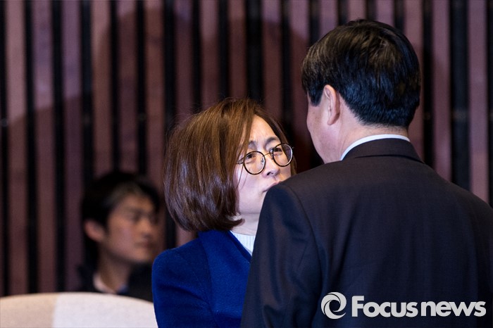 (서울=포커스뉴스) 이종걸 더불어민주당 원내대표가 29일 오후 서울 영등포구 국회에서 열린 의원총회에 자리해 은수미 더불어민주당 의원과 대화를 나누고 있다.