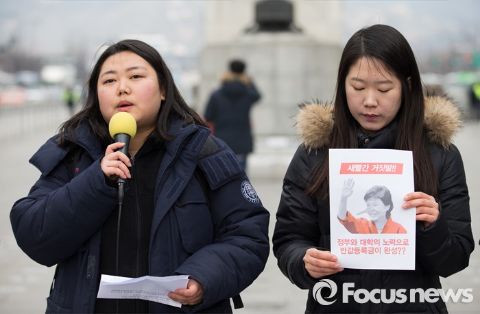 (서울=포커스뉴스) 29일 오후 서울 광화문광장에서 21세기 한국대학생연합 회원들이 정부의 반값등록금을 촉구하는 기자회견을 하고 있다.