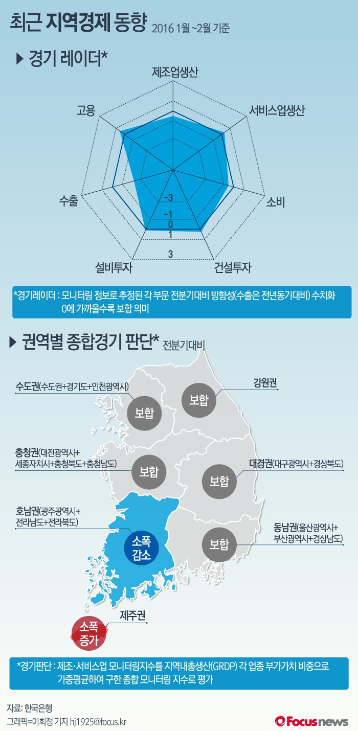 (서울=포커스뉴스) 29일 한국은행이 발표한 '지역경제보고서'를 살펴보면 올해 1~2월 중 국내 경기는 내수 회복세가 약화된 가운데 수출 부진으로 개선흐름이 주춤한 것으로 조사됐다. 권역별로는 대부분 전분기와 비슷한 보합 수준을 나타낸 가운데, 호남권은 소폭 감소했다. 다만 제주권은 국내외 관광객 증가 영향으로 호조세를 지속했다.