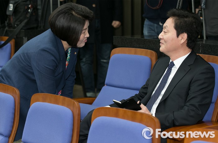 (서울=포커스뉴스) '공천 살생부' 관련 논란을 받고 있는 정두언(오른쪽) 새누리당 의원이 29일 오후 서울 여의도 국회에서 열린 의원총회에 참석해 손인춘 의원과 대화하고 있다. 정 의원은 지난 주말 한 언론 인터뷰에서 김무성 대표에게서 현역 의원 40여명의 '살생부' 이야기를 들었다고 전한 바 있다.