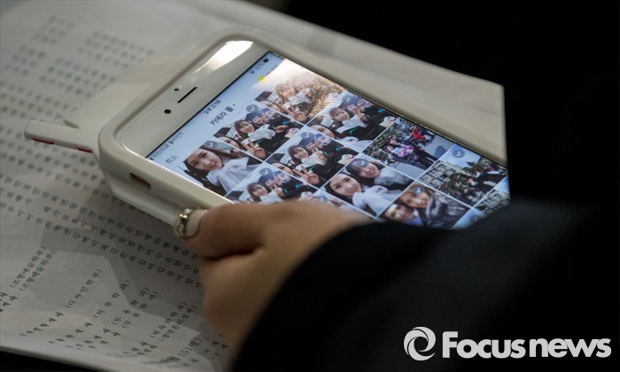 (서울=포커스뉴스) 29일 오후 서울 서대문구 이화여자대학교에서 열린 2015학년도 전기 학위수여식에 참석한 졸업생이 학우와 함께 찍은 기념사진들을 보고 있다.
