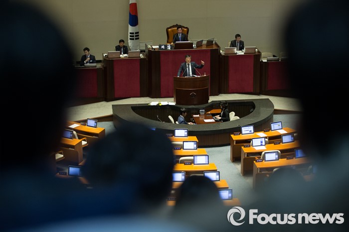 (서울=포커스뉴스) 테러방지법 직권상정에 반발해 야당이 무제한 토론(필리버스터)를 일주일째 진행하며 총 135시간을 돌파한 29일 오후, 서울 여의도 국회 본회의장 참관석에 시민들이 앉아있는 가운데 토론에 참여한 최원식 국민의당 의원이 발언하고 있다.