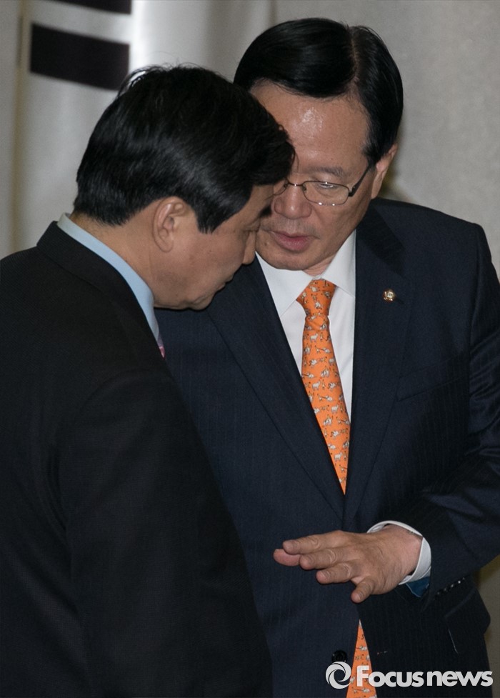 (서울=포커스뉴스) 테러방지법 직권상정에 반발해 야당이 무제한 토론(필리버스터)를 일주일째 진행하며 약 140시간을 돌파한 29일 오후 서울 여의도 국회 본회의장에서 정의화(오른쪽) 국회의장과 이종걸 더불어민주당 원내대표가 만나 대화하고 있다.