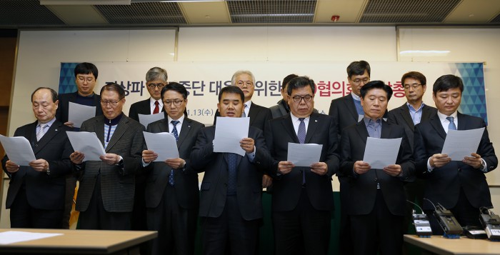 이날까지 협상이 이뤄지지 않으면 지상파는 또다시 VOD 공급 중단이라는 강수를 둘 전망이다. 케이블 가입자는 지속적으로 VOD 시청권을 침해받고 있는 셈이다. 케이블 관계자는 “협상기한이 오늘까지 인데 자정을 기점으로 지상파가 VOD 공급을 다시 중단할 수 있다”며 “지상파에 달린 사안이라 케이블에서는 어떻게 할 수가 없다”고 말했다.SO대표들이 결의문을 낭독하고 있다.<사진제공=한국케이블TV협회>