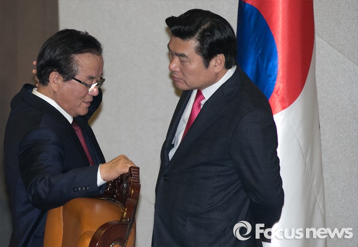 (서울=포커스뉴스) 테러방지법 직권상정에 반발해 야당이 무제한 토론(필리버스터)를 일주일째 진행하며 약 140시간을 돌파한 29일 오후 서울 여의도 국회 본회의장에서 정갑윤(왼쪽) 국회 부의장과 원유철 새누리당 원내대표가 대화하고 있다.