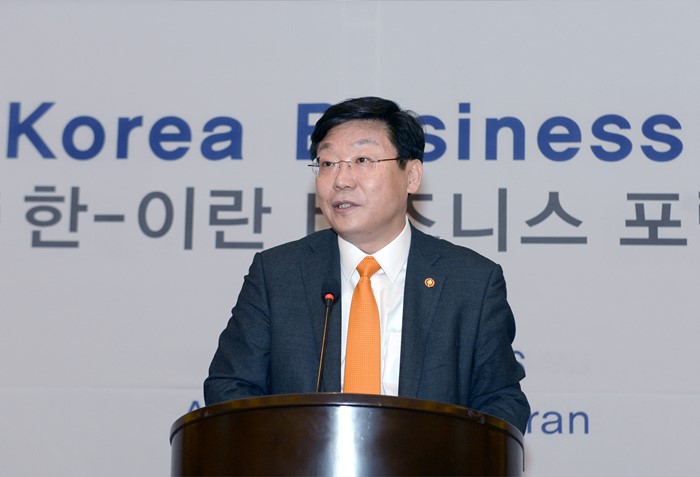 (서울=포커스뉴스) 주형환 산업통상자원부 장관이 29일(현지시간) 이란 테헤란 아자디호텔 자린홀에서 열린 한-이란 경제협력 비즈니스 포럼에 참석해 축사를 하고 있다. <사진제공=산업통상자원부>