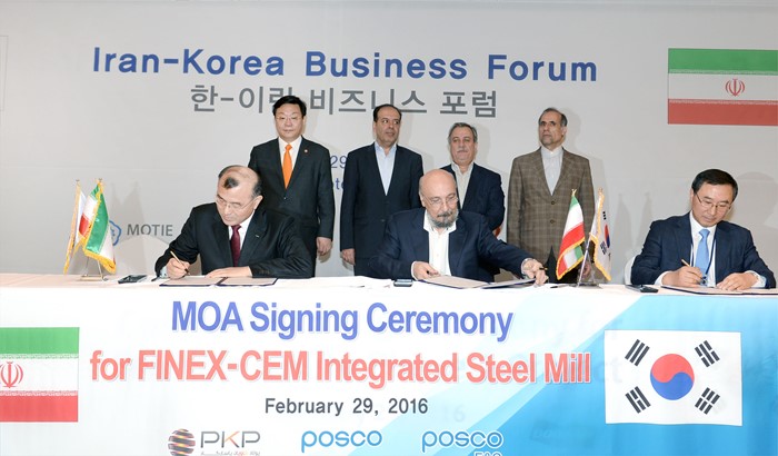 (서울=포커스뉴스) 주형환 산업통상자원부 장관은 29일(현지시간) 이란 테헤란 아자디호텔 자린홀에서 열린 '한-이란 비즈니스 포럼'에 참석하여, 포스코, 포스코건설, PKP사의 3자간 “160만톤 열연코일 제조를 위한 FINEX-CEM 제철소 건설”에 관한 '차바하 제철소 건설 관련 MOA 체결식'에 임석하고 있다.