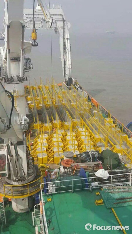 (서울=포커스포토) 세월호 주변을 둘러싸는 사각펜스 등 자재를 실은 상하이샐비지 소속 선박(센첸하오, Shen qian Hao)*이 지난 26일 낮 중국 상하이를 출발해 29일 오전 10시 30분경 목포신항으로 들어왔다. 해수부는 이번에 설치할 철제 사각펜스는 앞으로 선수들기 및 인양시 유실방지망을 설치할 수 없는 선체 좌현쪽 개구부 등을 통한 유실을 방지하기 위하여 가로 200m×세로 160m×높이 3m 규모로 눈금 2.0㎝ 직사각형 모양의 철재망 36개 세트로서 25일간 설치할 예정이라고 밝혔다. <사진제공=해양수산부>