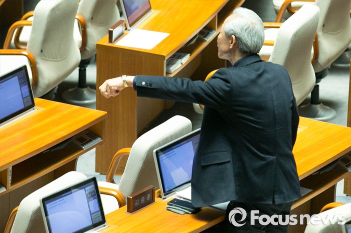 (서울=포커스뉴스) 김종훈 새누리당 의원이 1일 오전 서울 여의도 국회 본회의장에서 임수경 의원의 무제한 토론(필리버스터)에 대해 항의하고 있다.