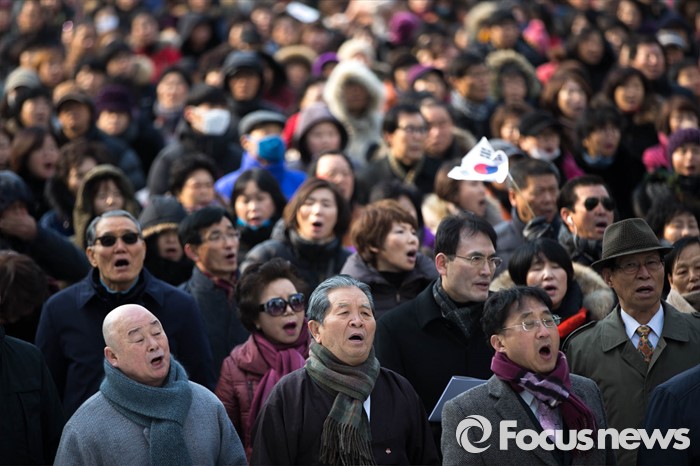 (서울=포커스뉴스) 1일 오후 서울 시청 앞 광장에서 열린 '북핵폐기 삼일절 국민대회 및 구국기도회'에 참석한 보수단체 회원들이 애국가를 부르고 있다.