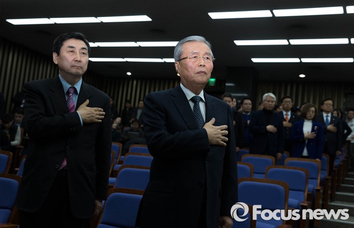 (서울=포커스뉴스) 더불어민주당이 필러버스터 중단을 예고한 1일 오후 이종걸 더민주 원내대표와 김종인 비대위 대표가 서울 여의도 국회에서 열린 의원총회에 참석, 국기에 대한 경례를 하고 있다.