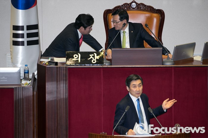 (서울=포커스뉴스) 테러방지법 직권상정에 반발해 야당이 세계 최장 기록의 필리버스터(무제한 토론)를 이어가고 있는 2일 오전 서울 여의도 국회 본회의장에서 토론에 참여한 이종걸(앞) 더불어민주당 원내대표의 발언 중에 정의화(뒤 오른쪽) 국회의장과 원유철 새누리당 원내대표가 대화하고 있다. 야당은 이날 필리버스터를 중단하고 선거법 등을 처리할 예정이다.