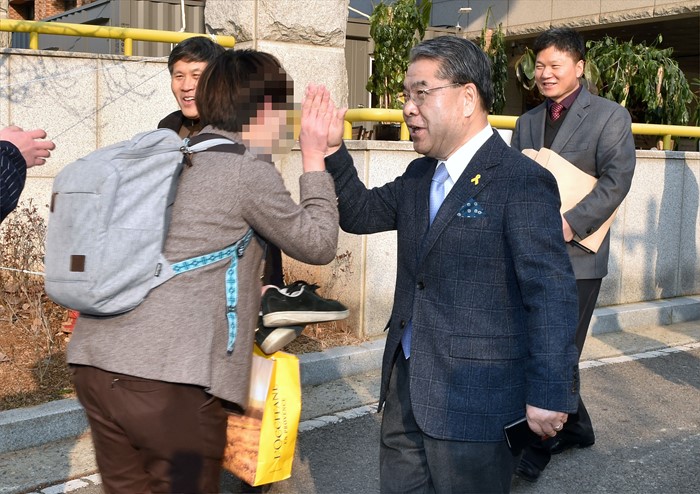 (서울=포커스뉴스) 2일 오전 경기도 안산 단원고등학교에서 교육 현장방문을 마친 이재정 경기도교육감이 학생들과 인사를 하고 있다. <사진제공=경기도교육청>