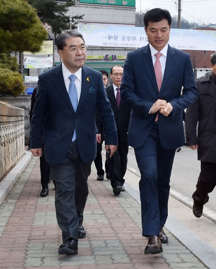 (서울=포커스뉴스) 교육 현장방문을 한 이재정(왼쪽) 경기도교육감이 2일 오전 경기도 안산시 단원고등학교에서 정광윤 신임 교장의 안내를 받아 건물로 들어가고 있다. <사진제공=경기도교육청>