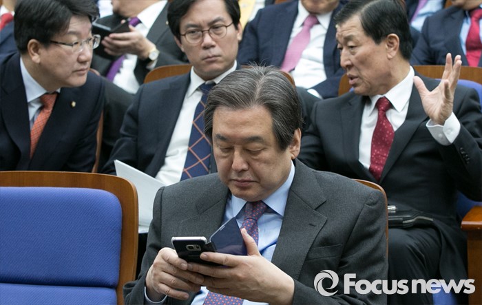 (서울=포커스뉴스) 김무성(앞) 새누리당 대표가 2일 오전 서울 여의도 국회에서 열린 의원총회에 참석해 전화기를 보고 있다.