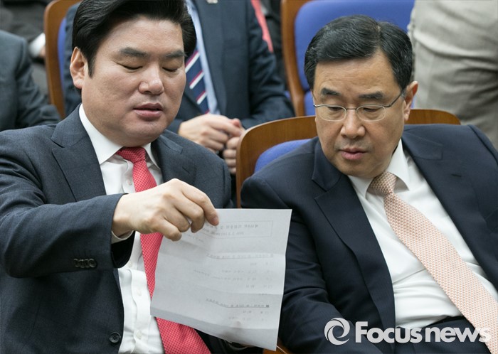 (서울=포커스뉴스) 원유철(왼쪽) 새누리당 원내대표와 김정훈 정책위의장이 2일 오전 서울 여의도 국회에서 열린 의원총회에 참석해 문서를 보고 있다.