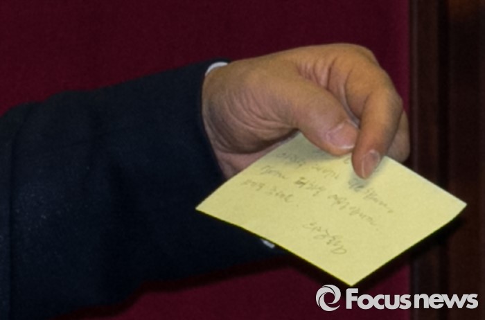 (서울=포커스뉴스) 테러방지법 직권상정에 반발해 야당이 세계 최장 기록의 필리버스터(무제한 토론)를 이어가고 있는 2일 오전 서울 여의도 국회 본회의장에서 토론에 참여한 이종걸 더불어민주당 원내대표가 발언 중 국회 관계자로부터 전달받은 메모를 보고 있다. 야당은 이날 필리버스터를 중단하고 선거법 등을 처리할 예정이다.