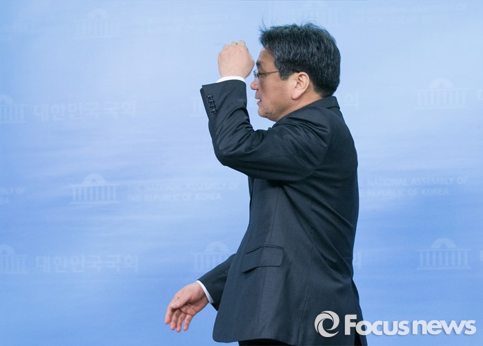 (서울=포커스뉴스) 강기정 더불어민주당 의원이 2일 오전 서울 여의도 국회 정론관에서 거취표명 기자회견을 마치고 단상을 내려오고 있다.