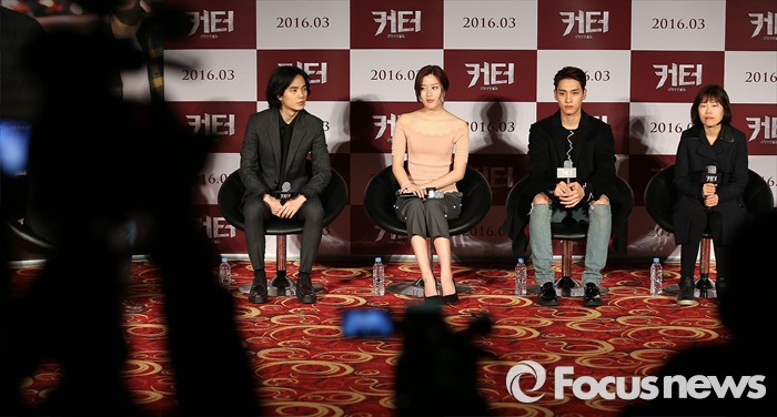 (서울=포커스뉴스) 2일 오전 서울 광진구 롯데시네마 건대입구점에서 열린 영화 '커터'(감독 정희성) 제작보고회에 참석한 배우 김시후(왼쪽부터), 문가영, 최태준과 영화감독 정희성이 주변을 살펴보고 있다.