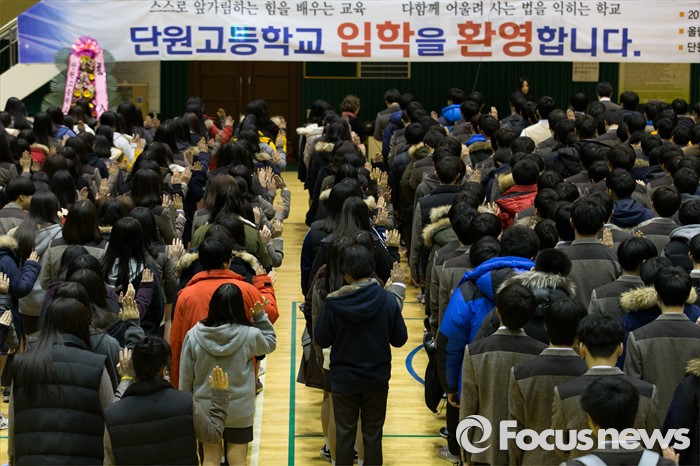 (안산=포커스뉴스) 2일 오전 경기도 안산시 단원구 올림픽기념관에서 열린 단원고등학교 입학식에 참석한 신입생들이 입학선서 하고 있다.