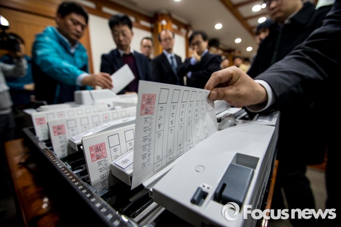 (과천=포커스뉴스) 2일 오전 경기도 과천시 중앙선거관리위원회에서 열린 '투표지분류기 및 선상투표 쉴드팩스 시연'에서 중앙선관위 직원이 투표지분류기 시연을 하고 있다.