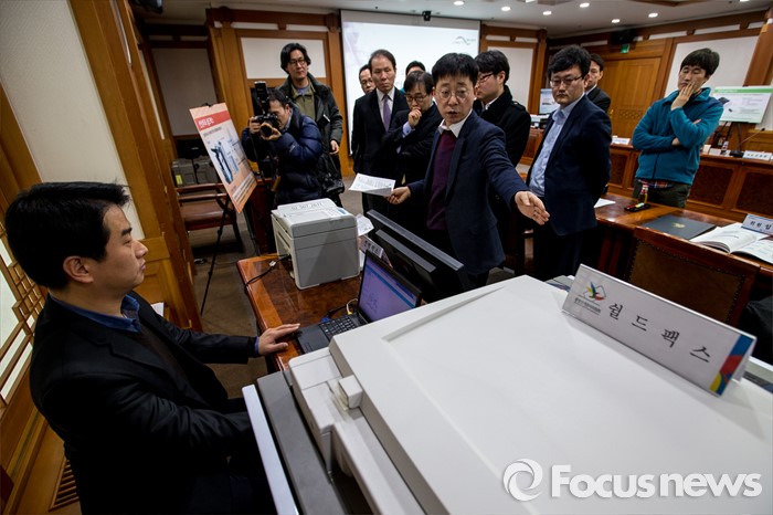 (과천=포커스뉴스) 2일 오전 경기도 과천시 중앙선거관리위원회에서 열린 '투표지분류기 및 선상투표 쉴드팩스 시연'에서 중앙선관위 직원이 선상투표 쉴드팩스 시연을 하고 있다.