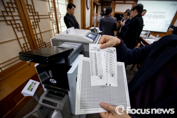 (과천=포커스뉴스) 2일 오전 경기도 과천시 중앙선거관리위원회에서 열린 '투표지분류기 및 선상투표 쉴드팩스 시연'에서 중앙선관위 직원이 선상투표에 사용될 투표용지를 견본을 선보이고 있다.