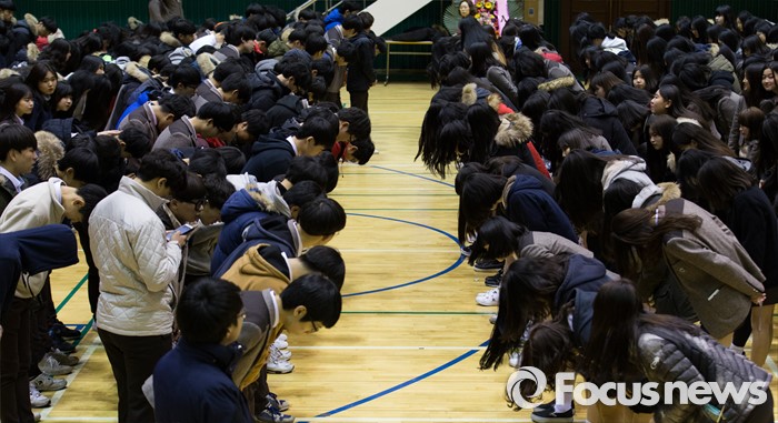 (안산=포커스뉴스) 2일 오전 경기도 안산시 단원구 올림픽기념관에서 열린 단원고등학교 입학식에 참석한 신입생들이 재학생들과 인사하고 있다.