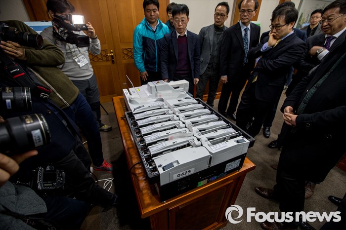 (과천=포커스뉴스) 2일 오전 경기도 과천시 중앙선거관리위원회에서 열린 '투표지분류기 및 선상투표 쉴드팩스 시연'에서 중앙선관위 직원이 투표지분류기 시연을 하고 있다.