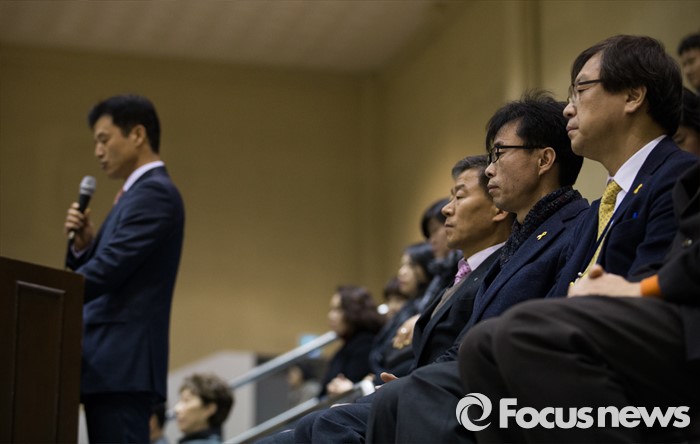 (안산=포커스뉴스) 전명선(오른쪽 두번째) 4·16 가족협의회 위원장이 2일 오전 경기도 안산시 단원구 올림픽기념관에서 열린 단원고등학교 입학식에 참석해 정광윤 신임 교장의 인사말을 듣고 있다.