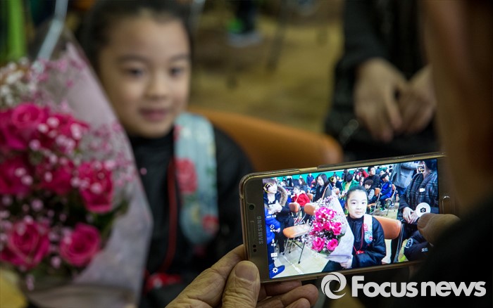 (서울=포커스뉴스) 2일 오전 서울 이태원 초등학교에서 열린 2016학년도 입학식에 참석한 신입생이 기념촬영을 하고 있다.