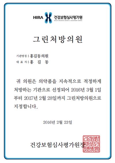 이어 “그린처방의원 지정서 배포를 통해 해당 의료기관은 의약품 적정 처방기관이라는 이미지를 갖게 되고, 국민은 안전하고 꼭 필요한 의약품을 처방하는 의료기관을 선택하는데 도움이 될 것”이라고 덧붙였다.그린처방의원 지정서 <사진출처=건강보험심사평가원>