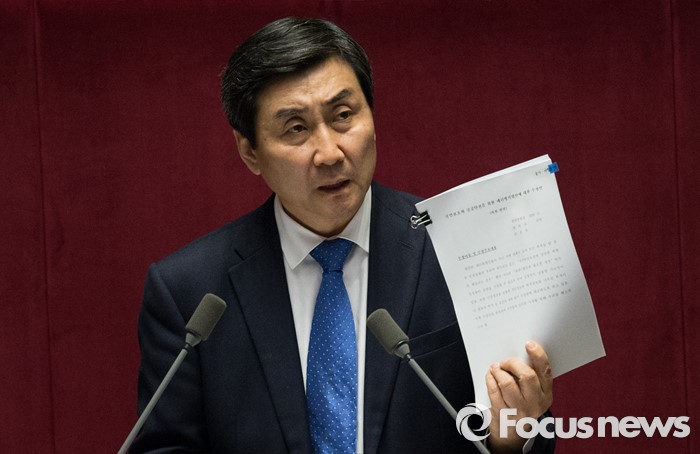 (서울=포커스뉴스) 테러방지법 직권상정에 반발해 야당이 세계 최장 기록의 필리버스터(무제한 토론)를 이어가고 있는 2일 오후, 서울 여의도 국회 본회의장에서 토론에 참여한 이종걸 더불어민주당 원내대표가 '국민보호와 공공안전을 위한 테러방지법안에 대한 수정안'을 보여주며 직권상정 된 테러방지법이 아닌 수정안이 통과 되어야 한다고 의원들과 국민들에게 호소하고 있다.