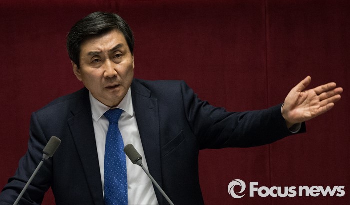 (서울=포커스뉴스) 테러방지법 직권상정에 반발해 야당이 세계 최장 기록의 필리버스터(무제한 토론)를 이어가고 있는 2일 오후, 서울 여의도 국회 본회의장에서 토론에 참여한 이종걸 더불어민주당 원내대표가 '국민보호와 공공안전을 위한 테러방지법안에 대한 수정안'을 보여준 후 직권상정 된 테러방지법이 아닌 수정안이 통과 되어야 한다고 의원들과 국민들에게 호소하고 있다.