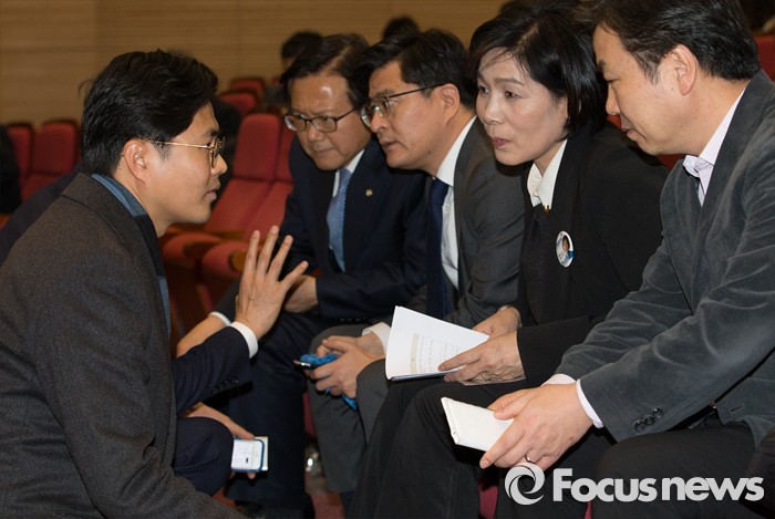 (서울=포커스뉴스) 2일 오후 서울 여의도 국회 의원회관에서 열린 테러방지법, 필리버스터, 시민의 자유에 관한 만민공동회 행사에서 필리버스터에 참여했던 야당 의원들이 행사 내용과 관련해 대화를 나누고 있다.
