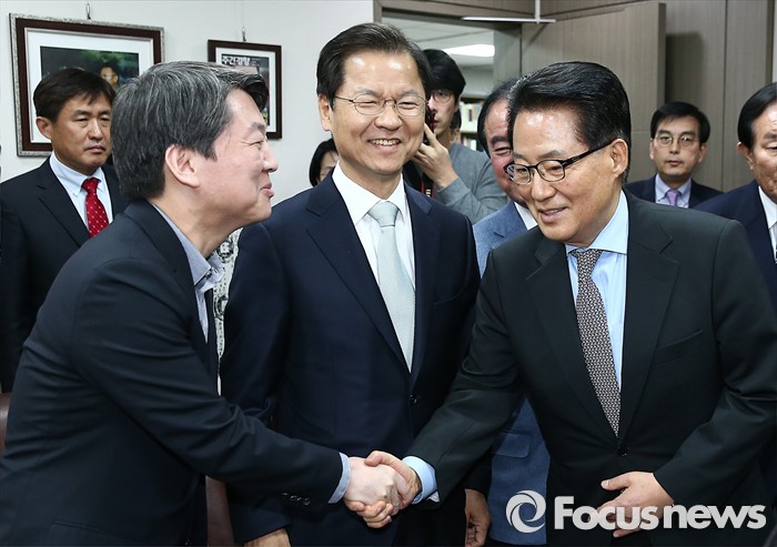 (서울=포커스뉴스) 국민의당 안철수(왼쪽), 천정배(가운데) 공동대표가 2일 오후 서울 여의도 국회 의원회관 박지원 의원 집무실을 방문해, 박 의원과 회동 전 악수하고 있다.