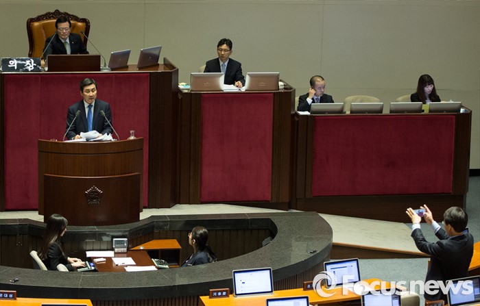 (서울=포커스뉴스) 더불어민주당 이종걸 원내대표가 12시간 31분만에 필리버스터(무제한 토론)을 끝마쳤다. 39번째 필리버스터 전사로 나섰던 이 원내대표를 끝으로 지난 9일간 필리버스터는 192시간만에 종료됐다. 2일 오후 서울 여의도 국회 본회의장에서 이춘석 원내수석부대표가 최장시간 무제한 토론을 하고 있는 이종걸 원내대표의 기념사진을 찍고 있다.